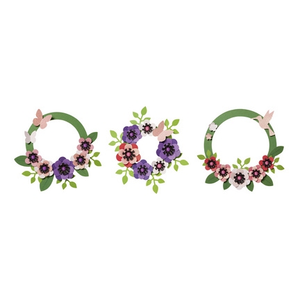 kit complet pour 3 couronnes de fleurs en papier dans 3 tailles différentes (200 mm, 250 mm, 300 mm), toutes les pièces sont prédécoupées, avec instructions en images (21904)