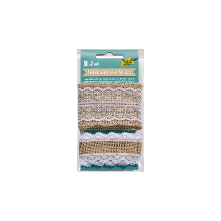 folia Ruban de jute avec dentelle, 2 x 1 m ruban de jute aspect naturel, rustique, 1 m de long pour chacune des 2 largeurs, avec dentelles, pour décorer, créer ou bricoler, de nombreuses utilisations sont possibles Spitze Polyester