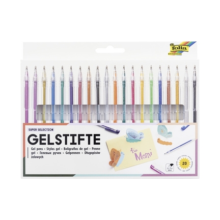 folia Stylo gel SUPER SELECTION, étui de 20 largeur de tracé: env. 1 mm, parfait pour écrire et colorier avec effets métallisés et pailletés, surtout sur papier fon- cé, assorti en 10 couleurs pastels & 10 pailletées contenu : 20 pièces (1929)