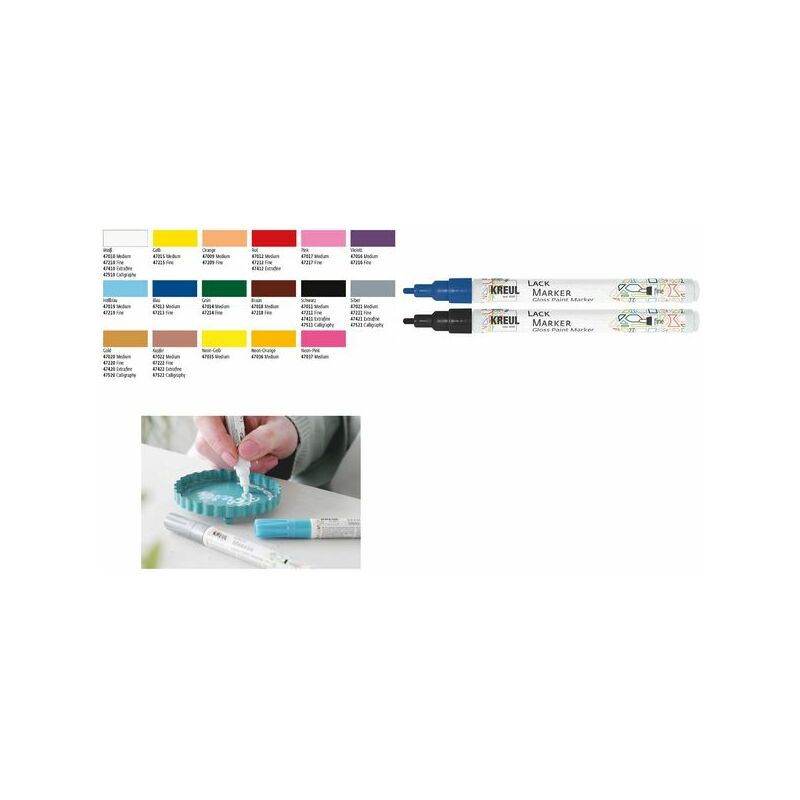• à conserver à plat Instructions pour le marqueur laque Hobby Line: Veuillez bien agiter avec capuchon fermé avant l’utilisation. Veuillez bien pomper par des pressions répétées jusqu’à ce que l’encre soit visible. Puis essayer de faire quleques lignes d’abord sur le papier avant de commencer votre dessin. Veuillez bien fermer le capuchon avec un “clic”. Astuces: 1. Les surfaces à dessiner devraient être bien propres et dégraissées2. Pour un flux d’encre régulier veuillez à pomper de temps à autre pendant que vous dessiner. Pour ceci veuillez fermer le capuchon, bien agiter le marqueur et pomper 2 à 3 fois 3. Ne jamais laisser le marqueur trop longtemps ouvert faute de quoi la pointe va sécher Exemples d’utilisation: – Pour créer, décorer et inscrire des petites cadeaux originaux Adapté pour:- artistes amateurs- écoles_x000D_