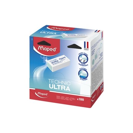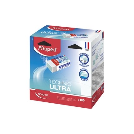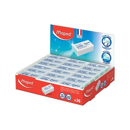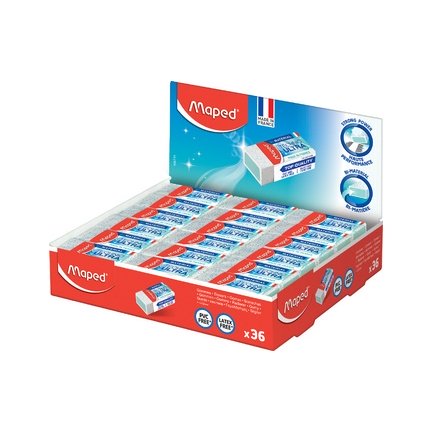 Maped Gomme en plastique Technic Ultra Mini, présentoir de 36, blanc, nouvelle technologie de fabrication, bi-matière, coeur ultra-efficace, extérieur de la gomme très résistant, peu de résidus, sans PVC, avec fourreau en carton, en paquet de 36 dans le p